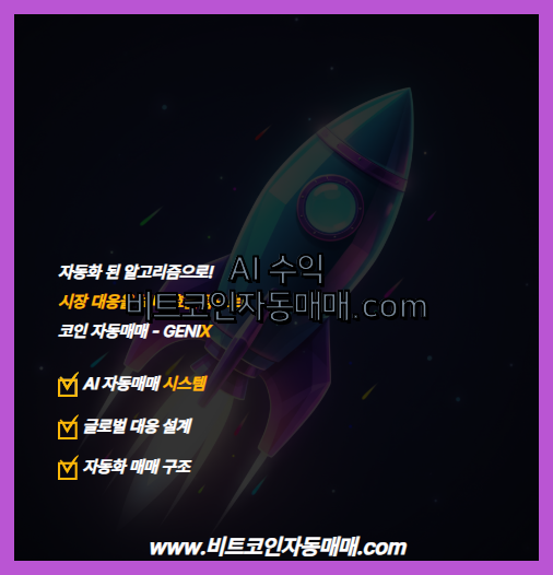 코인 비트AI자동거래와 AI 비트AI자동거래를 고민하고 있다면 AI 트레이딩 시스템 GENIX GENIX를 통해 직접 경험해보시기 바랍니다. 텔레그램 1:1 문의 : genix_trading